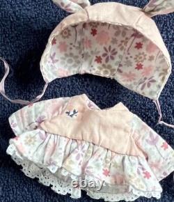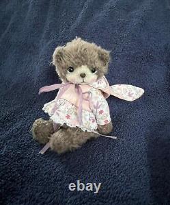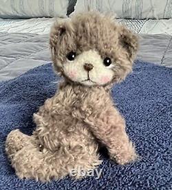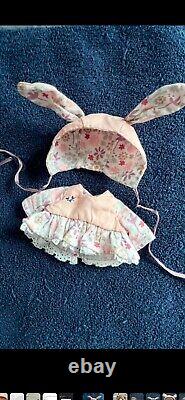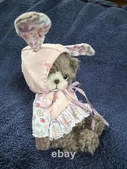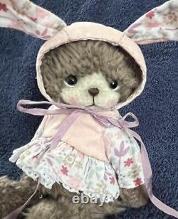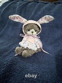 Crocheted with hairy yarn and granules stuffed in tummy so there is a little weight to her. Artist has used her own pattern to make bear so it is truly one of a kind bear. 4 1/2 handmade collectors bear with handmade cotton bunny dress and hat outfit which can be removed.