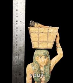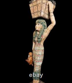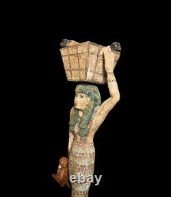 In a perfect scene the Egyptian pharaoh Offering-Bearer like the original one, Hand made from Natural wood with perfect hand carving and beautiful colors and amazing details like the original one in the Metropolitan Museum, Look closely to see what she is carrying in her right hand-it's a duck! She also has a basket filled with cuts of meat balanced perfectly on her head.