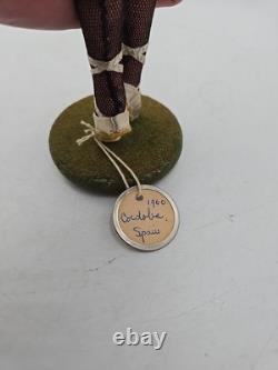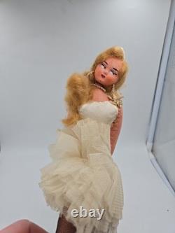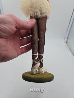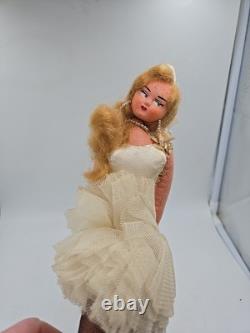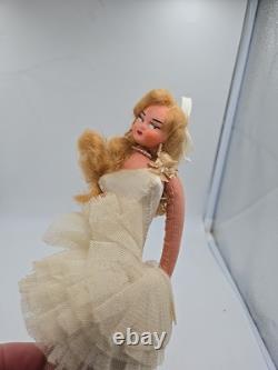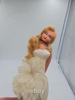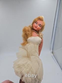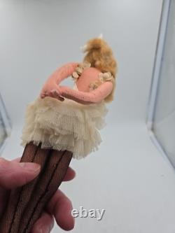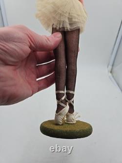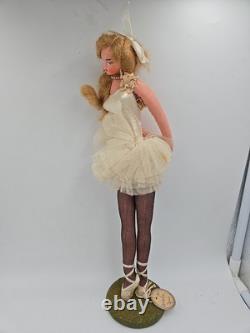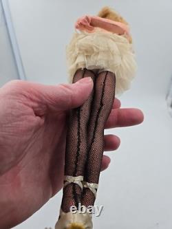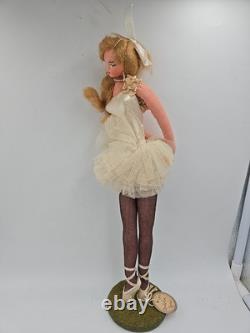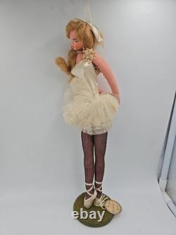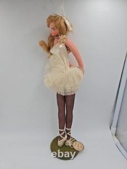 Du plastique sous le tissu qui est cousu sur Cette poupée ballerine vintage est un objet de collection unique en son genre mesurant 12 pouces de haut. Avec des cheveux blonds et des yeux blancs, cette poupée fille est faite de tissu et de plastique, ce qui ajoute à son charme unique. Parfaite pour les collectionneurs de poupées ou ceux qui cherchent à ajouter une touche vintage spéciale à leur collection de poupées, cette poupée ballerine dégage un attrait nostalgique et intemporel.
